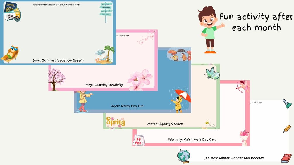 Fun Activity Pages: After every month, kids can enjoy coloring pages based on different yearly seasons.